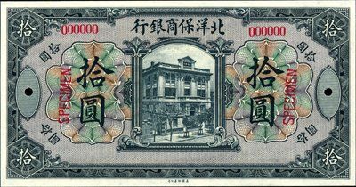 1919. P-S2516 Unlisted Trial Color. 10 Yuan. Specimen trial color banknote. Choice Unc. Unlisted color black instead of issued color green on face and black instead of green back. Red specimen overprint, POC's and "000000" serial numbers. Rare banknote. ABNC