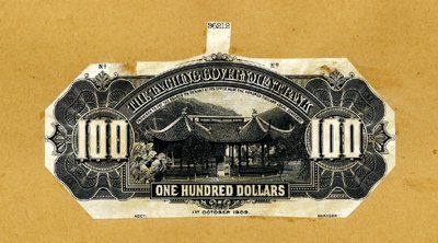 1909. P-A78B Unlisted. $100 Back proof of this rare issue. Printed in black on india paper and mounted on manila file folder. Rare note and unique in archive in this format. CV $1,200 in VF. VG condition with some glue bleed through and minor tears from mounting.. ABNC.