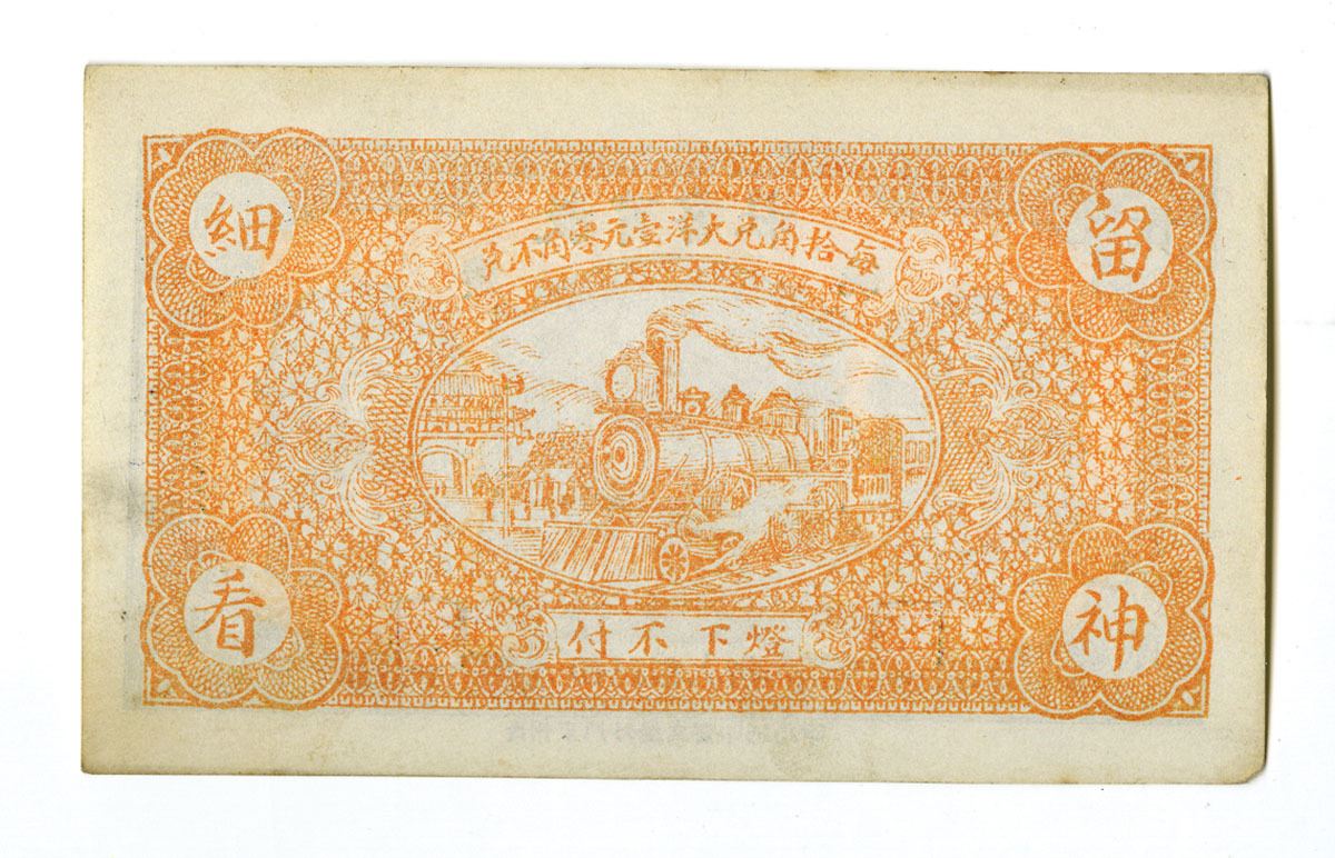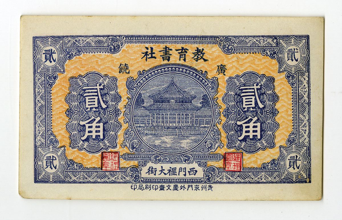 China, ca. 1930–1940s; 2 jiao merchant note issued by Jiaoyu Shushe with location reference Ximenli Street. Temple of Heaven front and locomotive reverse. Condition: VF to XF.