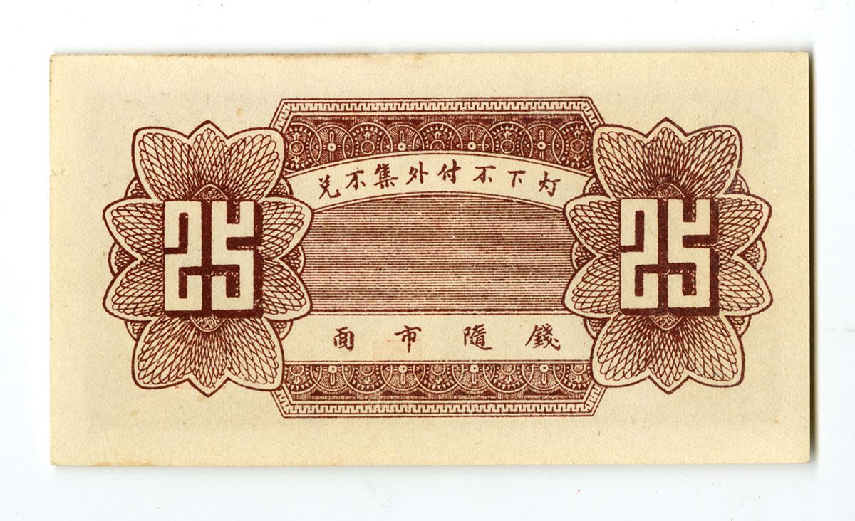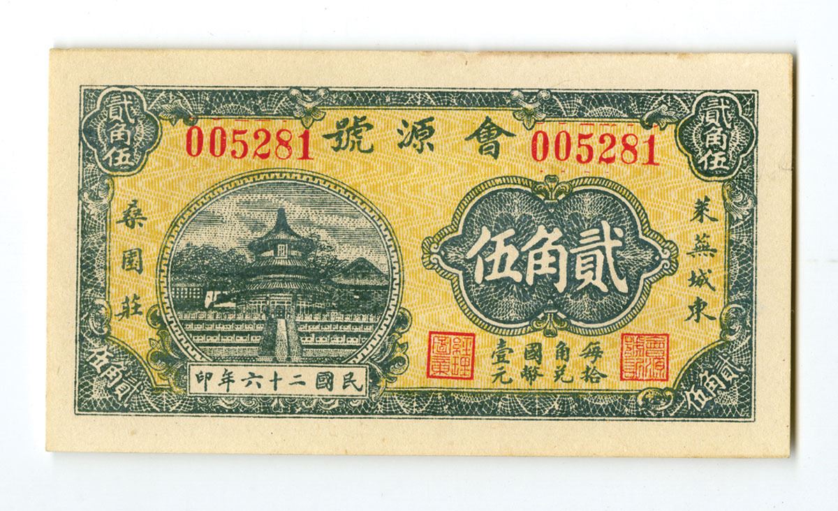 Issued by Yuanhui Company in Wucheng County, Zhejiang Province. Denomination 5 jiao with central ‘National Temple’ vignette. Serial numbers and guarantee of redeemability for coin. Date panel refers to ‘Republic Year 62, Jia-shen Year,’ corresponding to approx. 1944. Reverse includes anti-counterfeit motto, Buddhist symbols, and inscription ‘Yuanhui Market Coin.’