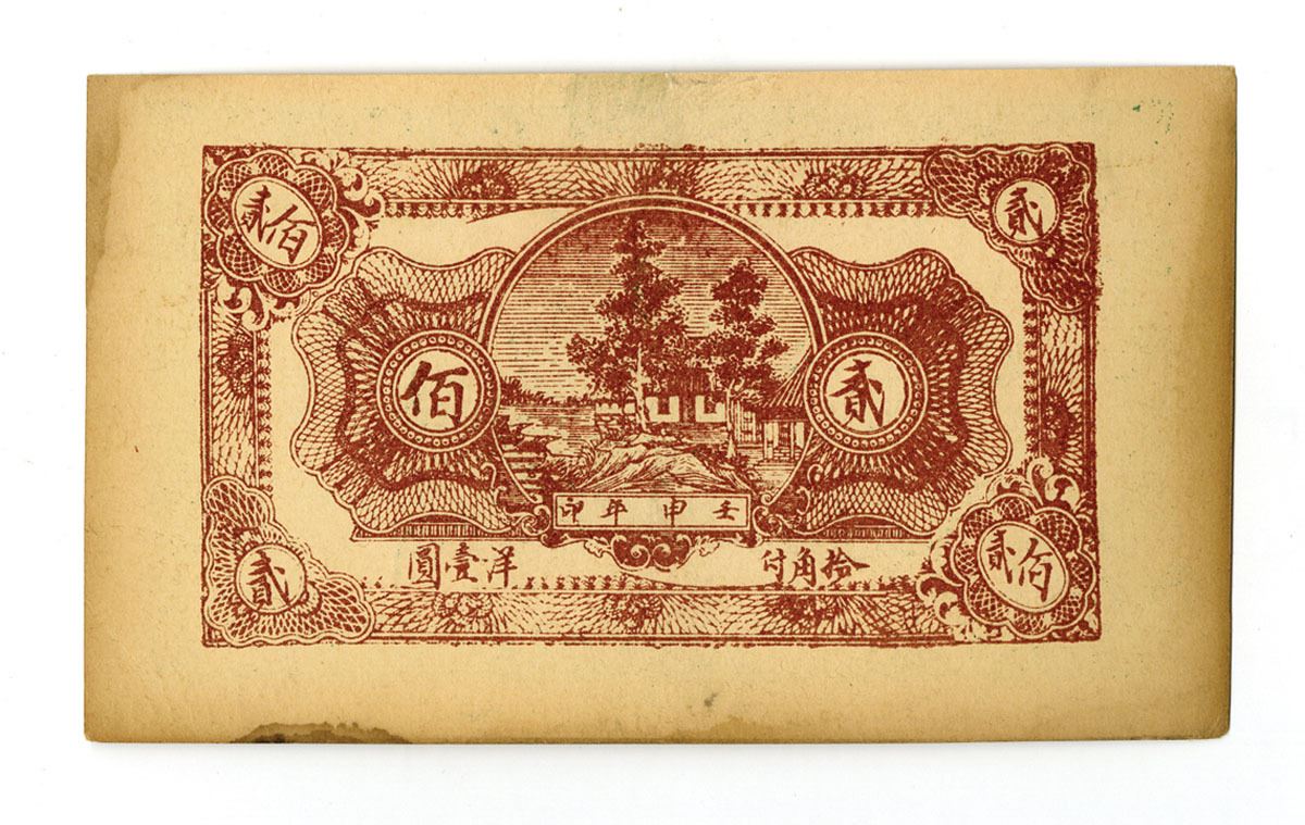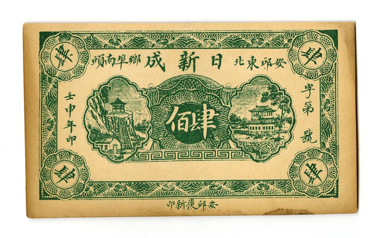 Anbei region, China, 1956; 1 jiao merchant note issued by Ri Xin Cheng with locality reference Northeast Andong. Scenic vignettes front and architectural reverse. Condition: VF or better.