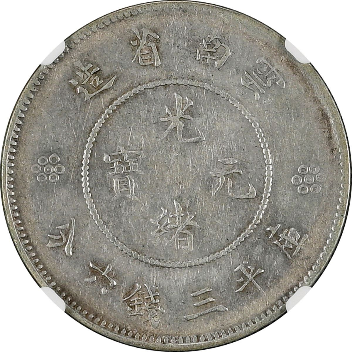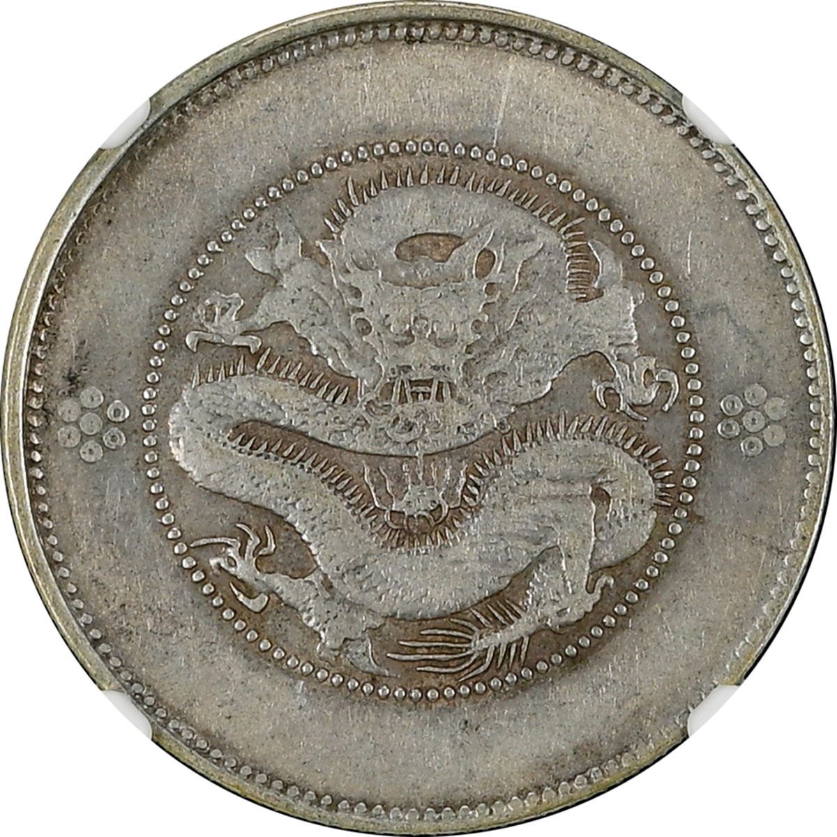 China: Yunnan Province, 3 Mace 6 Candareens (50 Cents), (1911), L&M-422, Silver, NGC Graded XF DETAILS - CLEANED. Swathed in a monochrome tapestry of soft grays, the coin possesses a subdued elegance, with the dragon's intricacies highlighted by a subtle contrast against the field. Despite the coin's cleaned history, it retains a quiet allure, its surface reflecting a muted luster that accentuates its finely struck details.