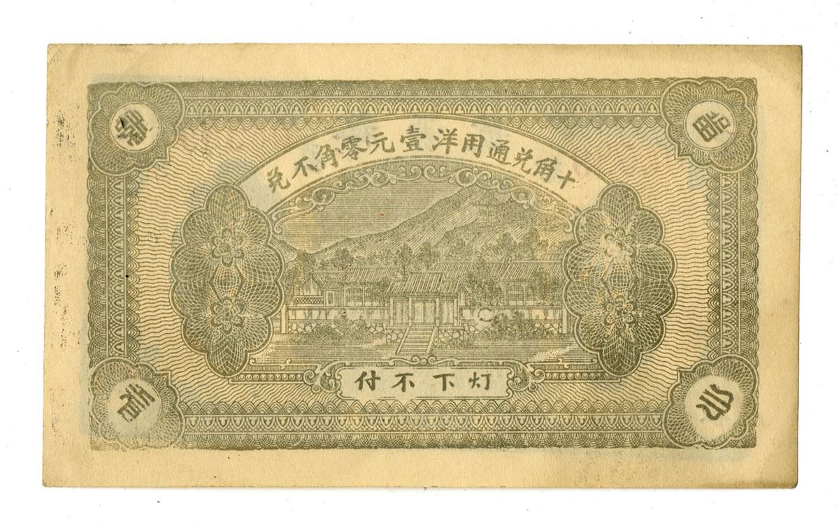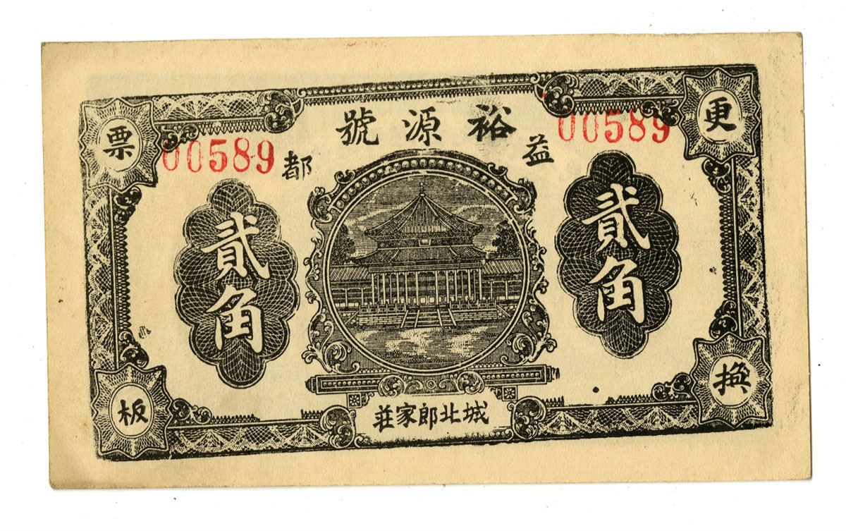 Issued by Yuyi Yuan Trading Company of Huajia Village, North City District. Denomination 2 jiao with architectural vignette. Validity and acceptance mottos typical of merchant scrip. Reverse features local market message, traditional auspicious seals, and indicates circulation limited to a ‘Lantern Market’ area. Undated but circa 1940s.