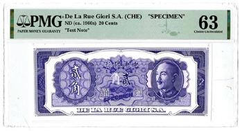 China & England, ND (ca. 1960-70s). Central Bank of China, 1946 (reprinted in the 1960s), 20 Cents, P-396, Used as a Specimen Test Note, Purple and white, Blank on back, Large excess border with cycloid design and "De La Rue Giori S.A." under the note. PMG graded Choice Uncirculated 63.