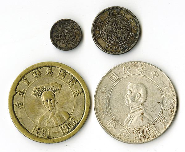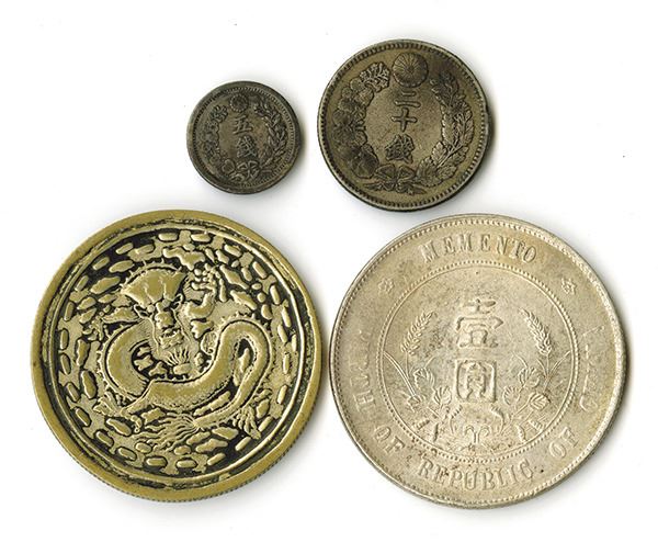 Lot includes silver Memento Dollar / Yuan dated 1912, AU-UNC; and a second Dollar / Yuan that is cast and possibly counterfeit. Also included from Japan 5 and 10 Sen, both VF+.
