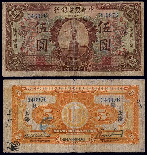 Shanghai, China, 15th July 1920. $5 Local Currency. P-S236b, Shanghai Branch, Issued banknote, Brown on m/c face with portrait of Statue of Liberty in middle, Back is orange with shield. VG condition with letter H on back, Serial # 346976. Rarely seen issued in any form or condition due to the short time period this bank was in business. ABNC.
