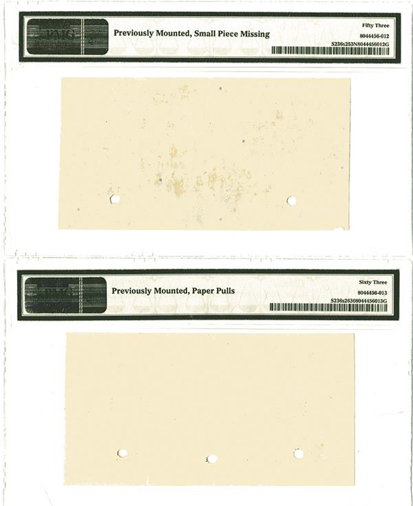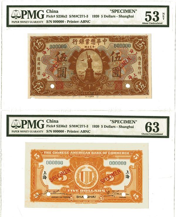 China, 1920. $5. P-S236s2. (S/M #C271-3d). Uniface Face and back banknotes, Specimen banknote. Brown on m/c underprint with Statue of liberty vignette in middle. Red specimen overprint, "00000" serial numbers and POC's. The back has Shanghai printed in English and Chinese as well as Signatures in English with sub-title "American Vice President" and "Manager", The face is PMG graded About Uncirculated 53 NET with note of a small chip off of the lower left corner and previously mounted, the back is PMG graded Choice Uncirculated 63 with note of paper pulls on back. Rare Shanghai issue. ABNC.
