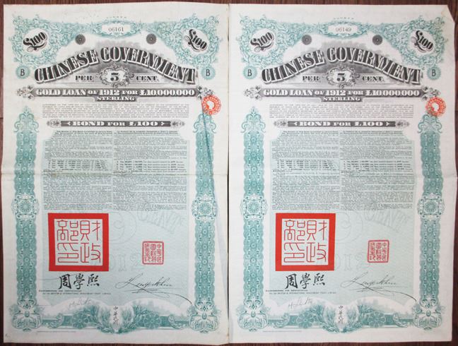 Imperial China. 1912. Lot of 2, £100, I/U 5% Coupon Bond Pair, Black text with ornate blue-green border and undertint. Choice Fine to VF condition with staple holes, toning, and writing at top. Printer: Roberts & Leete. (2).