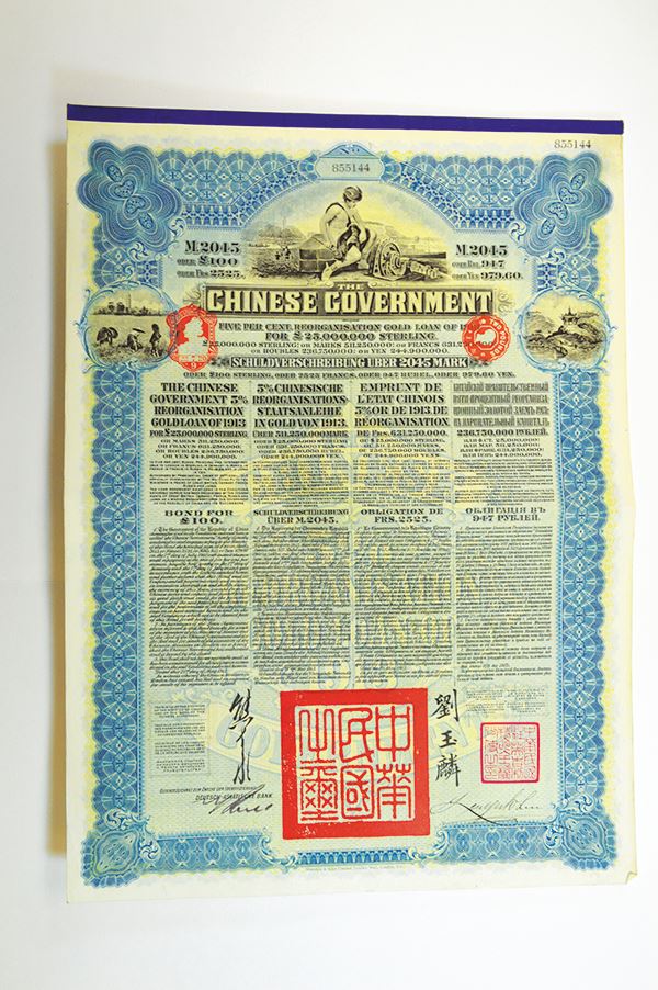 Issued by the Deutsch-Asiatische Bank. 100 Pounds. English, German, French, Russian texts. With coupons. 1 piece.