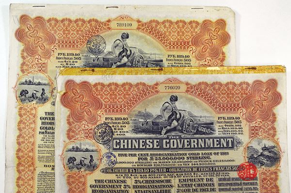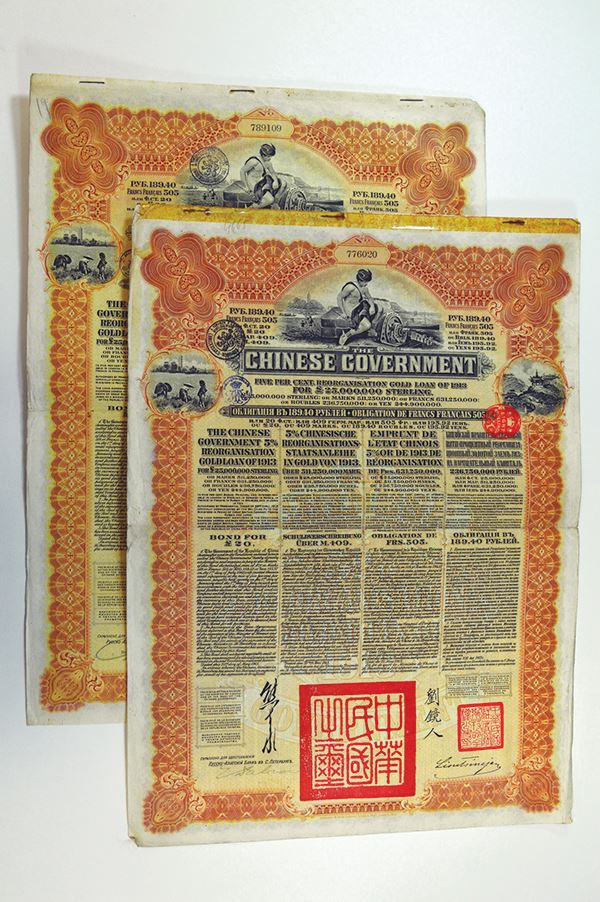 China. Russo-Asiatic Bank. 20 Pounds. Brown border. Large format with coupons. Very Fine, some edge roughness. 2 pieces.