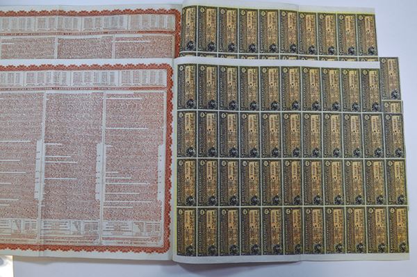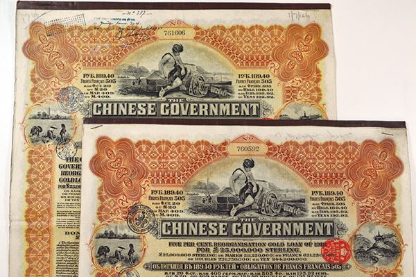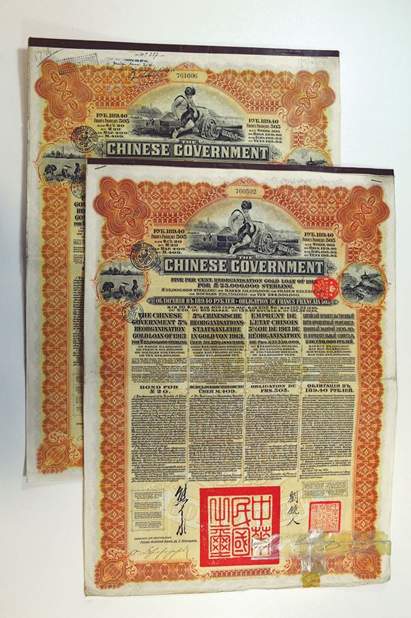 China. Russo-Asiatic Bank. 20 Pounds. Brown border. Large format with coupons. Very Fine, some edge roughness. 2 pieces.