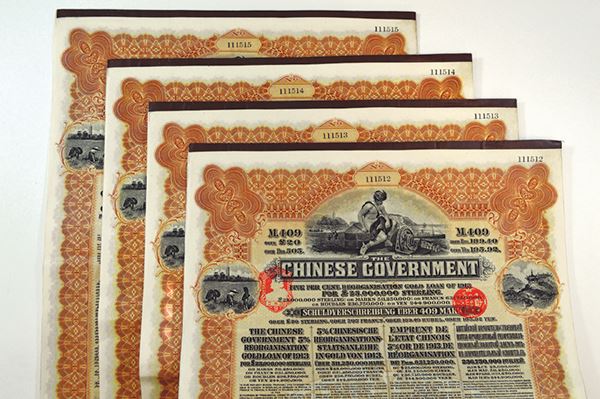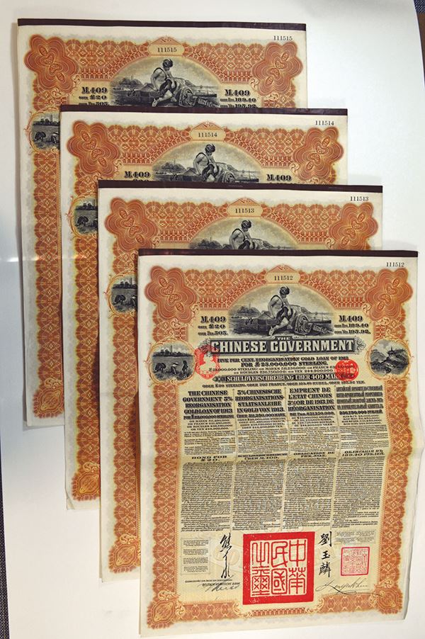 China. Deutsch-Asiatische Bank. 20 Pounds. Brown border. Large format with coupons. Very Fine+ some edge tone. 4 pieces.