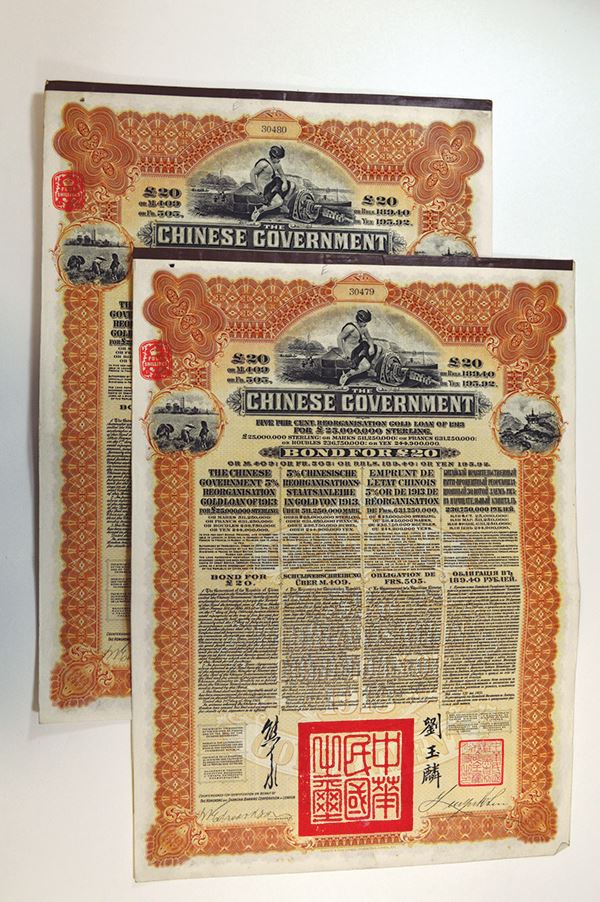 China. Hong Kong & Shanghai Banking Corporation in London. 20 Pounds. Brown border. Large format with coupons. Very Fine+ some edge tone. 2 pieces.