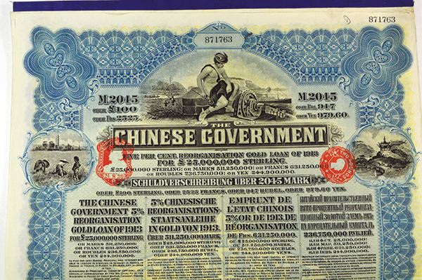 China. Deutsch-Asiatische Bank. 100 Pounds. Blue border. Large format with coupons. Very Fine+ some edge tone.