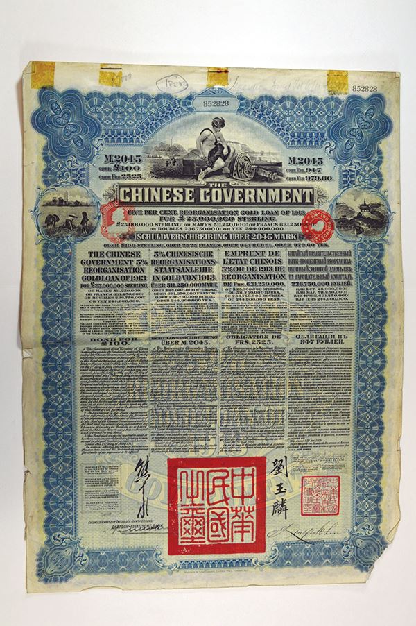 China. Deutsch-Asiatische Bank. 100 Pounds. Blue border. Large format with coupons. Very Fine+ some edge tone.