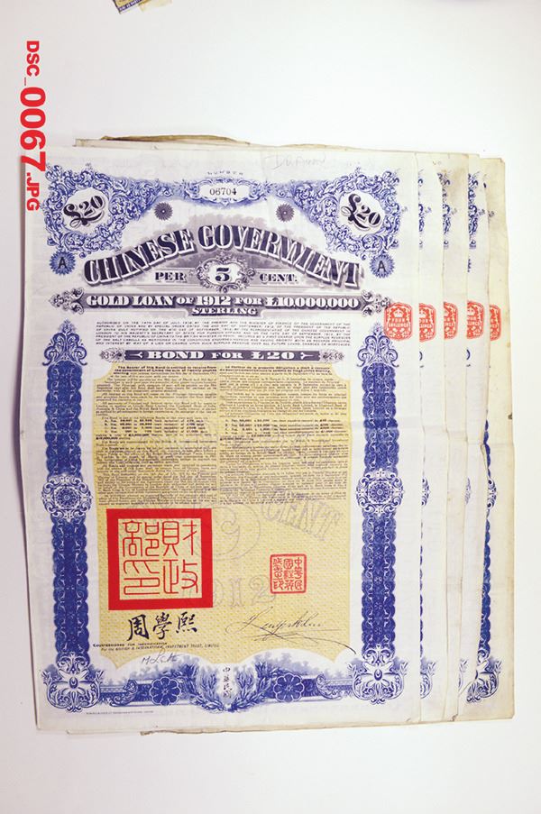 China. British & International Investment Trust, Ltd. Blue border on tan underprint. British tax stamp, coupons. Large format, rough handling. 5 pieces.