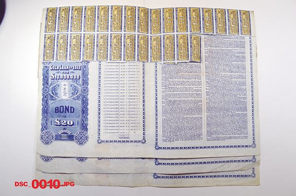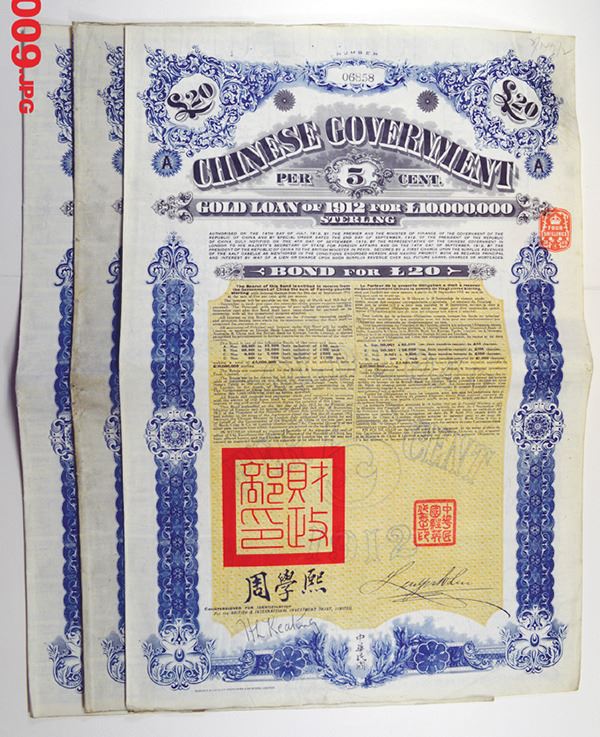 China. Lot of 3 bonds. All are 20 Pounds. British & International Investment Trust, Ltd. British tax stamp. Coupons attached. Fine. 3 pieces.