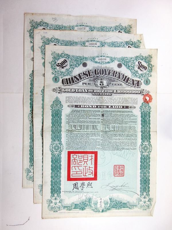 Chinese Government 5% Gold Loan of 1912 Issued Bond Trio.