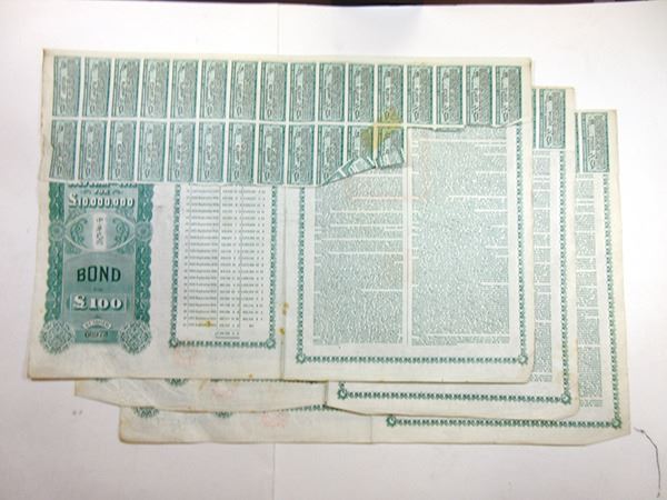 China. Lot of 3 bonds. £100 5% Issued Bond. Black print on green border and under tint, Some with pencil markings and some with red crayon writing in some margins. British & International Investment Trust, Ltd. British tax stamp. Coupons attached. Fine. 3 pieces.
