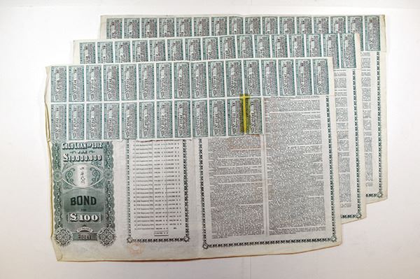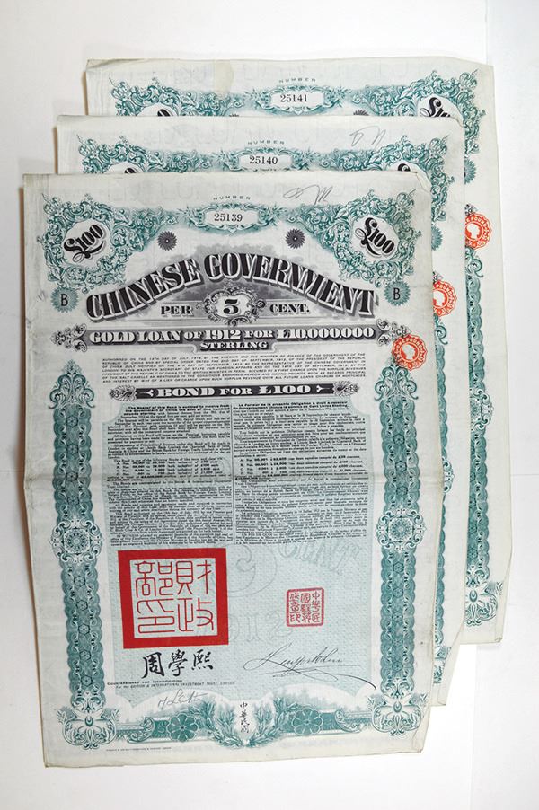China. 100 Pounds. British & International Investment Trust, Ltd. British tax stamp. Coupons attached. Fine. 3 pieces.