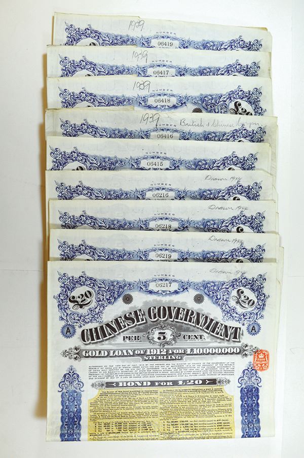 China. 20 Pounds. British & International Investment Trust, Ltd. British tax stamp. Coupons attached. Fine. 10 pieces.