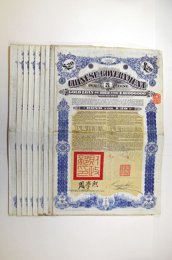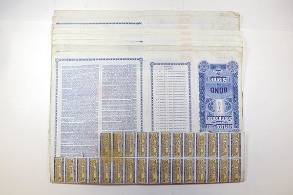 China. 20 Pounds. British & International Investment Trust, Ltd. British tax stamp. Coupons attached. Fine. 10 pieces.