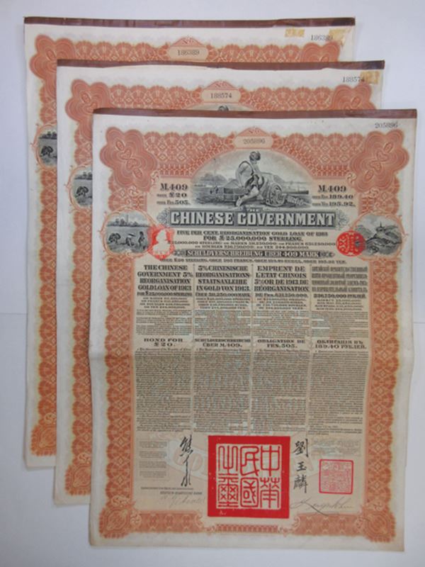 China. Lot of 3 bonds, All are 409 Marks or £20, I/U Bonds, Printed in English, German, French, and Russian on ornate certificate with large brown borders and multiple vignettes at top, British and German tax stamps at top, Fine-VF condition. 3 Pieces.