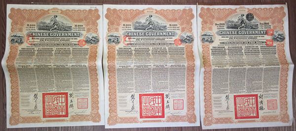 China, 1913. £20 I/U 5% Reorganization Gold Coupon Bond, Black text with brown border and yellow undertint, Allegorical mercury figure seated next to gear at top, bond is in English, German, French, and Russian. Fine to VF condition with some staining as well as signs of wear along top margin. Banque De L'Indo-Chine A Paris was the issuing bank. Printed by Waterlow & Sons Ltd. 3 pieces.