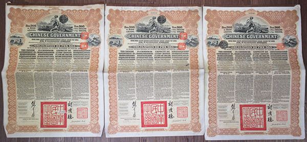 China, 1913. £20 I/U 5% Reorganization Gold Coupon Bond, Black text with brown border and yellow undertint, Allegorical mercury figure seated next to gear at top, bond is in English, German, French, and Russian. Fine to VF condition with some staining as well as signs of wear along top margin. Banque De L'Indo-Chine A Paris was the issuing bank. Printed by Waterlow & Sons Ltd. 3 pieces.