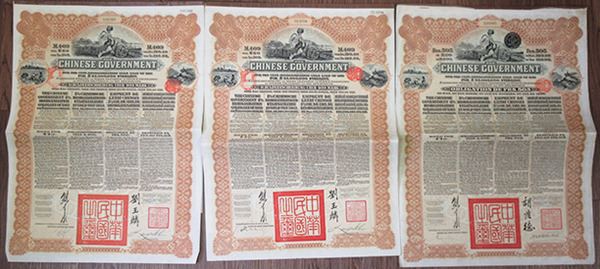 China, 1913. £20 I/U 5% Reorganization Gold Coupon Bond, Black text with brown border and yellow undertint, Allegorical mercury figure seated next to gear at top, bond is in English, German, French, and Russian. Fine to VF condition with some staining as well as signs of wear along top margin. Deutsch-Asiatische Bank was the issuing bank. Printed by Waterlow & Sons Ltd. 3 pieces.