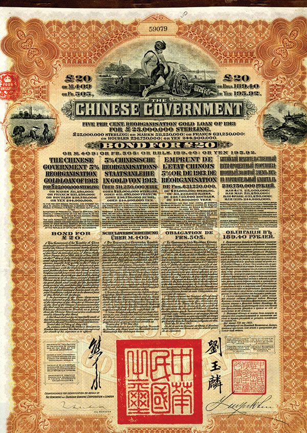 Lot of 4 bonds, all are 1913 20 Pound bonds with coupons attached. All are in VF to XF condition. Attractive bond assortment. W&S. Two are endorsed by the Hong Kong and Shanghai Banking Corp. and two by a Russian Bank.