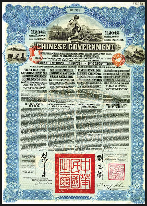 China, 1913, £100 Pounds Sterling, Issued and uncancelled, 43 coupons attached, Black on blue border and underprint with allegorical Mercury sitting on power generator with ships on top with rice harvesting on left and house on hill by shoreline on right, printed in English,, Russian, German and French. Issued by the Deutsche-Asiatische Bank. Fine+ to VF condition. Attractive and scarce bond. W&S.