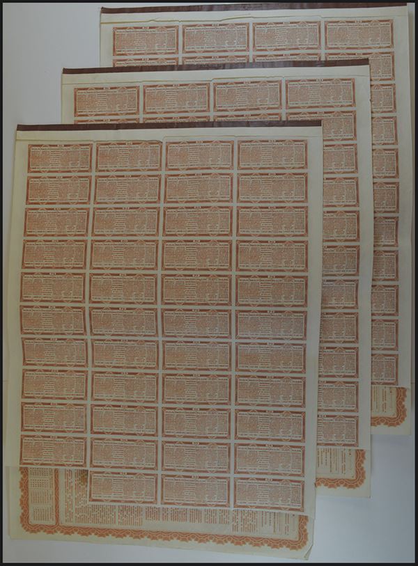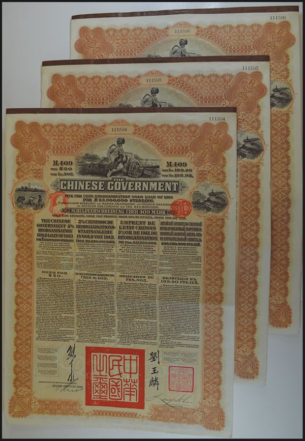China, brown frame, Deutsche-Asiatische Bank. With 43 coupons. 3 pieces.