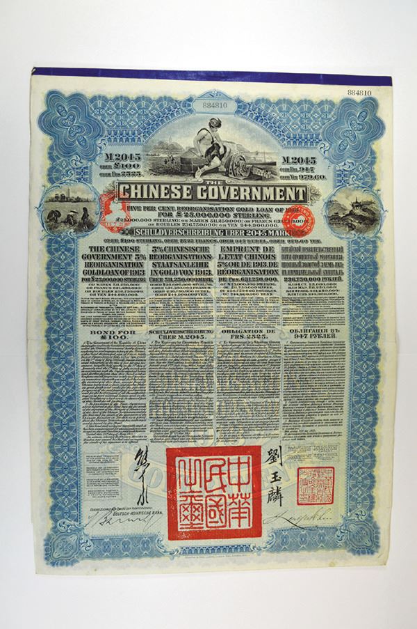 China, Republic. 2045 Marks. Blue Border. Coupons and tax stamps attached. Very Fine.