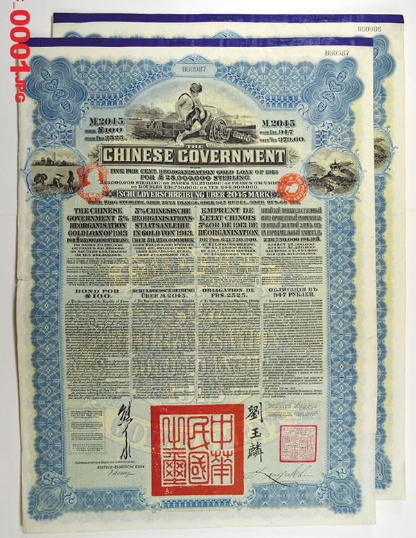 Chinese Government 5% Reorganization Gold Loan of 1913 Pair.