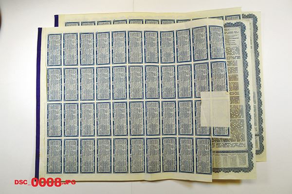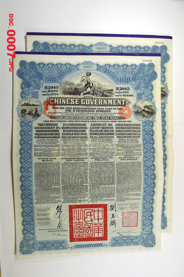 China, Lot of 2 bonds, both are 1913, £100 Pounds Sterling - 947 Rubles, 100 Pounds. Deutsch-Asiatische Bank. Issued and uncancelled, coupons attached, Blue border and underprint with allegorical Mercury sitting on power generator with ships on top with rice harvesting on left and house on hill by shoreline on right, written in 4 languages, Attractive bonds, W&S. (2)