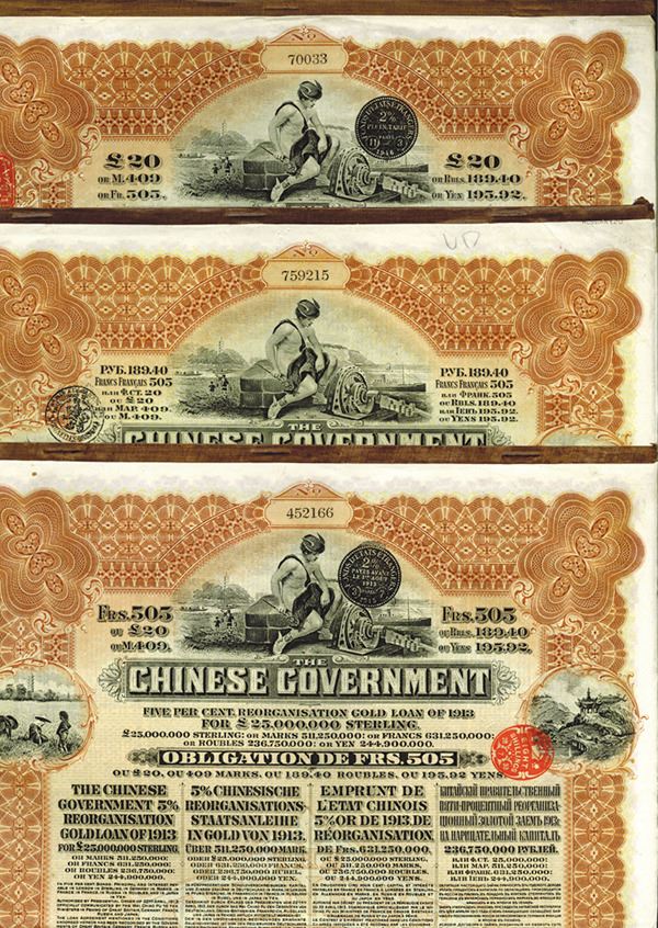 Lot of 3 Bonds, All are China, 1913, 20 Pounds Sterling - 189.40 Rubles and each is issued by one of 3 different banks, the Russo-Asiatic Bank, the HK & Shanghai Banking Corp., or the Banque De L'Indochine. All are Issued and uncancelled with coupons attached, Brown border and underprint with allegorical Mercury sitting on power generator with ships on top with rice harvesting on left and house on hill by shoreline on right, written in 4 languages, Attractive bond, W&S.