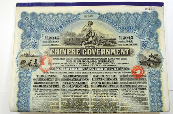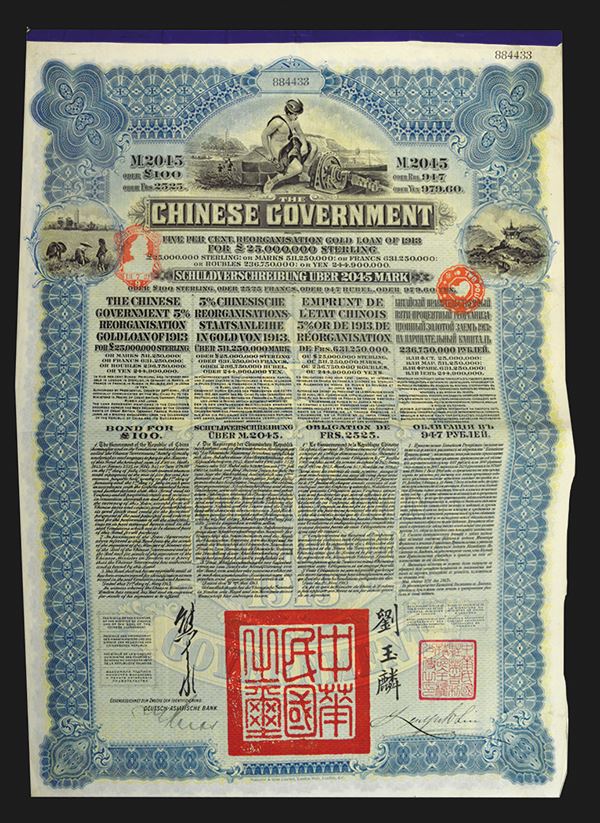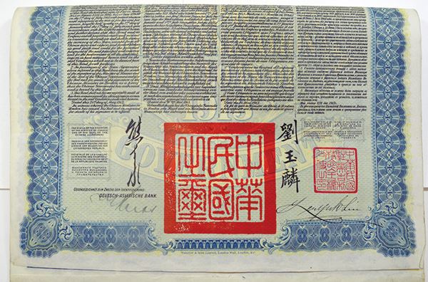 China, £100 = 2045 Mark. Blue border, yellow underprint. Deutsch-Asiatische Bank. 43 coupons attached. Extremely Fine.