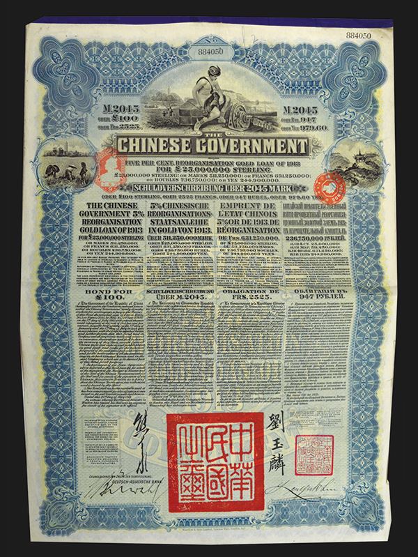 China, £100 = 2045 Mark. Blue border, yellow underprint. Deutsch-Asiatische Bank. 43 coupons attached. Very Fine.