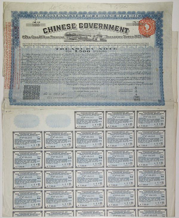 China, 1919. £500 I/U 8% Sterling Treasury Note 'Vickers Loan' Coupon Bond, Black text with blue border and undertint, Scene of a harbor at top. Fine condition with torn margins and stains. Printed by Bradbury, Wilkinson & Co. Ltd.