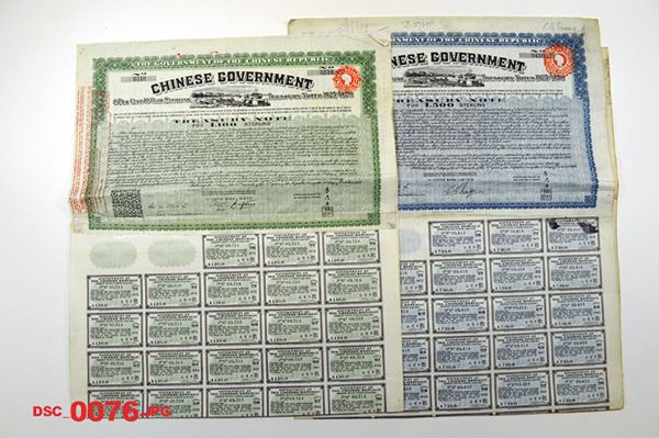 China. Lloyds Bank Ltd. The 100 Is green and black, the 500 is blue and black. 78 coupons, all but 5 remain. British tax stamp and overprint at left. Large format, rough handling. 2 pieces.