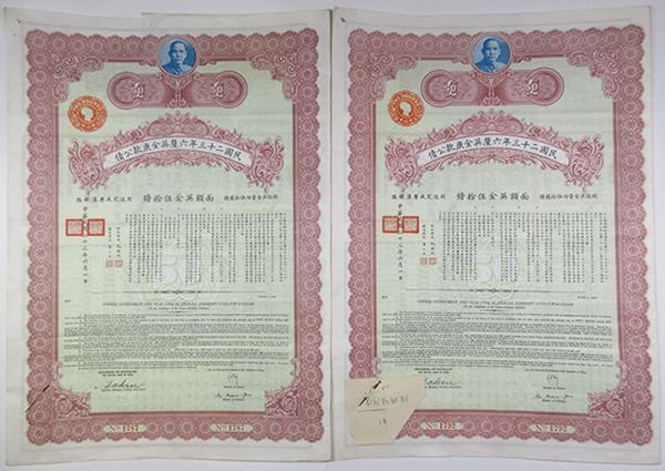 China, Lot of 2 bonds, Both are 1934. £50, I/U, 6% Sterling Indemnity Loan Coupon Bonds for the Completion of the Canton-Hankow Railway, Black text with brown border and light green undertint, Bond is in Chinese and English. Fine-VF condition with some staple holes as well as pins attached that have been rusted. (2 pieces).