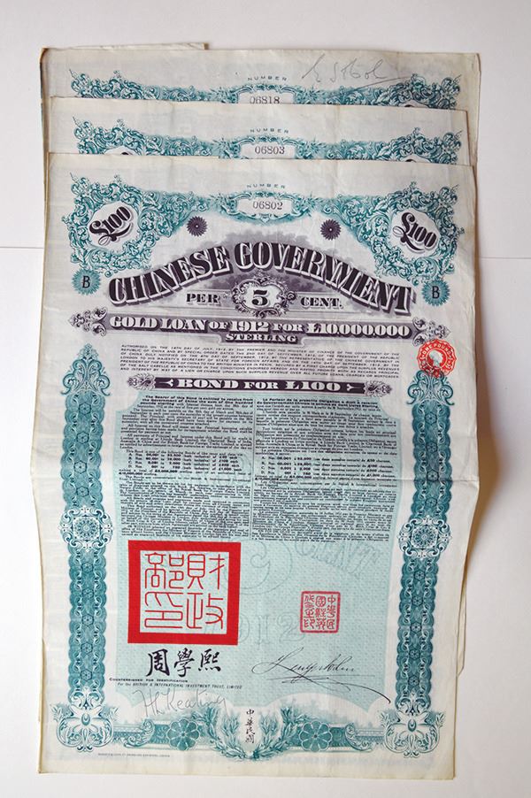 Chinese Government Gold Loan, 1912 Issued Trio of Bonds