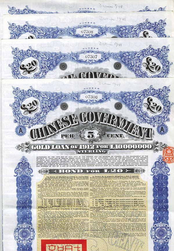 China. Lot of 4 bonds. £20 Issued 5% Coupon Bond, Black print on large blue border with gold underprint. British & International Investment Trust, Ltd. British tax stamp. Coupons attached. Fine.