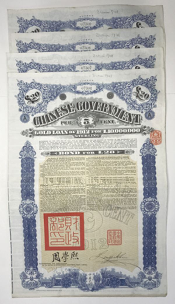 China. Lot of 4 bonds. £20 Issued 5% Coupon Bond, Black print on large blue border with gold underprint. British & International Investment Trust, Ltd. British tax stamp. Coupons attached. Fine.