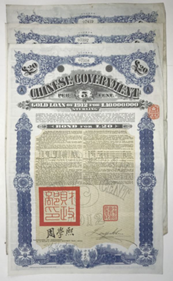 China. Lot of 4 bonds. £20 Issued 5% Coupon Bond, Black print on large blue border with gold underprint. British & International Investment Trust, Ltd. British tax stamp. Coupons attached. Fine.