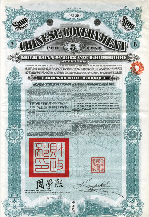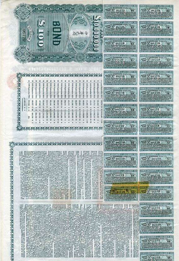 China, 1912. £100 I/U 5% Coupon Bond, Black text with ornate green border and undertint. S/N 06129, VF condition with staple holes, Printed by Roberts & Leete Ltd.