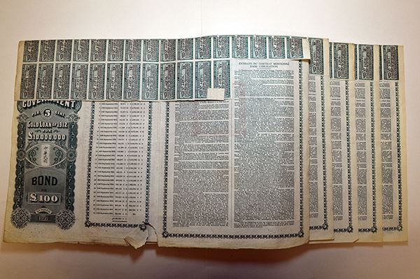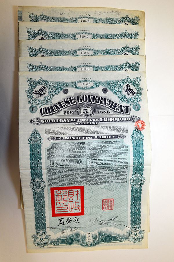 Issued by the British & International Investment Trust, Ltd. 100 Pounds. Green border. English and French text. With coupons. 5 pieces.