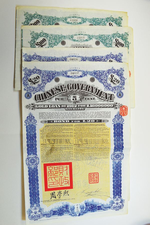 Issued by the British & International Investment Trust, Ltd. 20 and 100 Pounds. Blue and Green border. English and French text. With coupons. 2 of each, 4 pieces total.