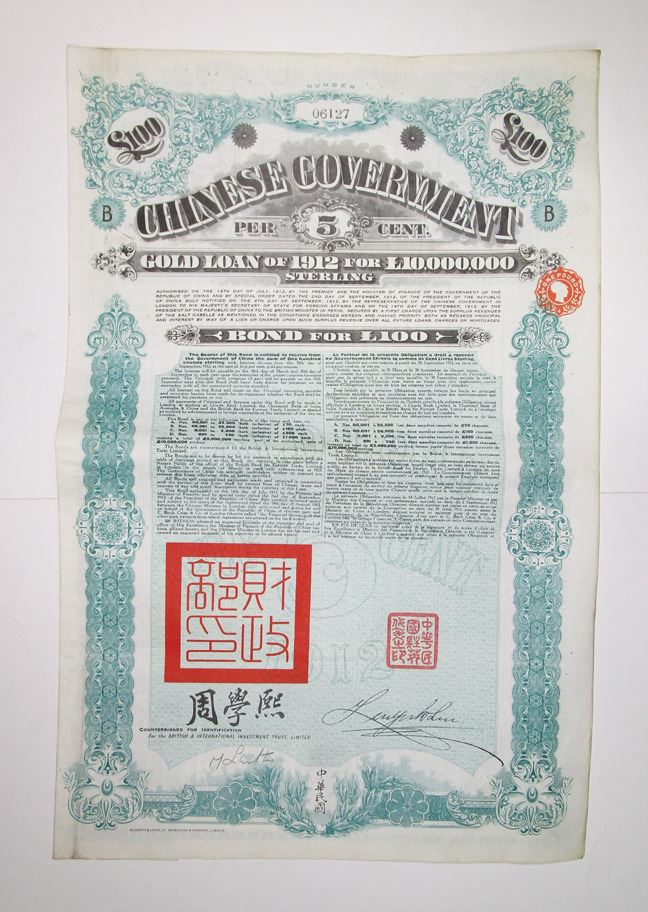 China, 1912. £100, I/U 5% Coupon Bond, Black text with ornate green border and undertint, S/N 06127, Fine-VF condition with staple holes, toning, and minor staining, Printer: Roberts & Lette Ltd.